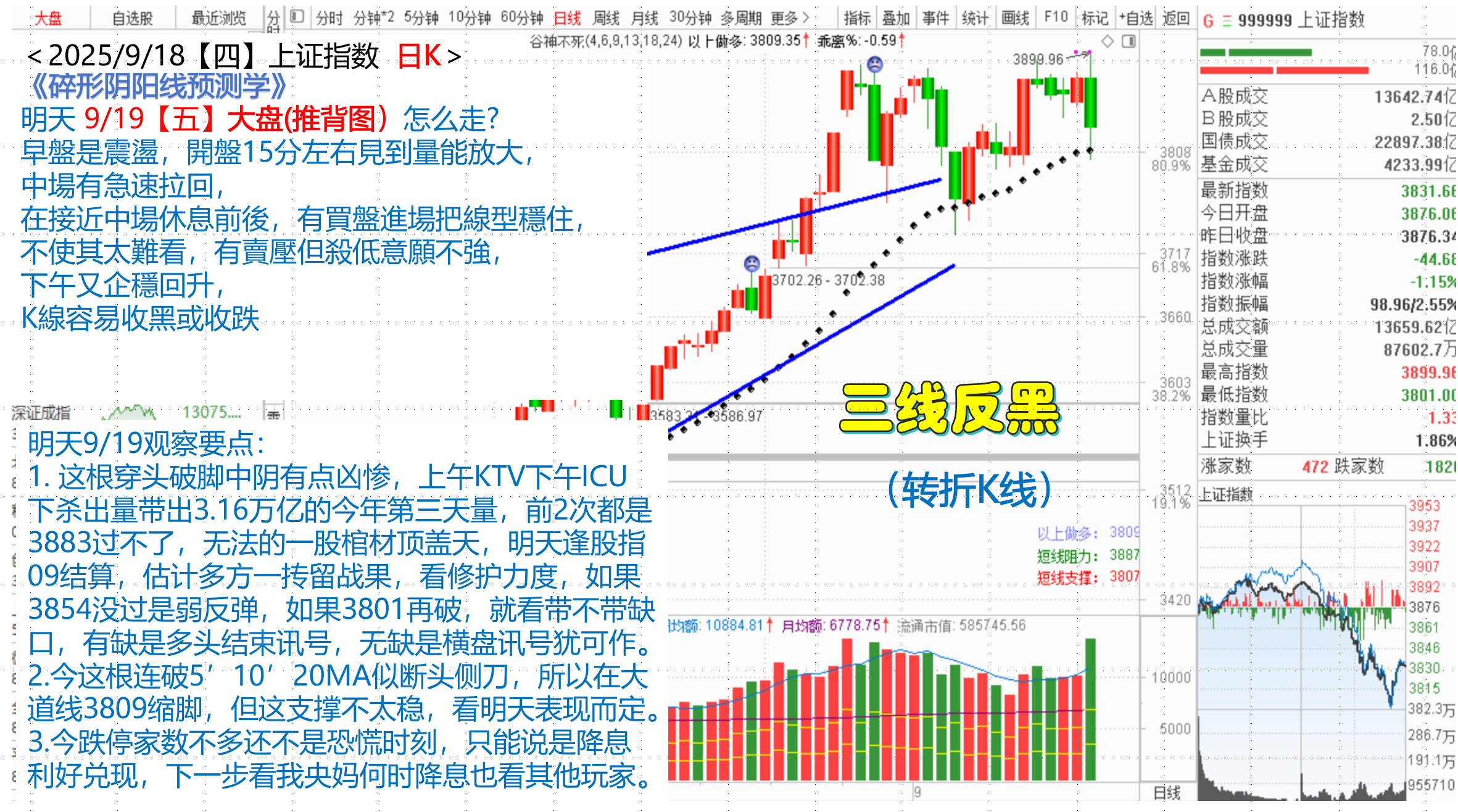(1) 这根穿头破脚中阴有点凶惨,上午KTV下午ICU下杀出量带出3.16万亿的今年第三天量,前2次都是3883过不了,无法的一股棺材顶盖天,明天逢股指09结算,估计多方一抟留战果,看修护力度,如果3854没过是弱反弹,如果3801再破,就看带不带缺口,有缺是多头结束讯号,无缺是横盘讯号犹可作。