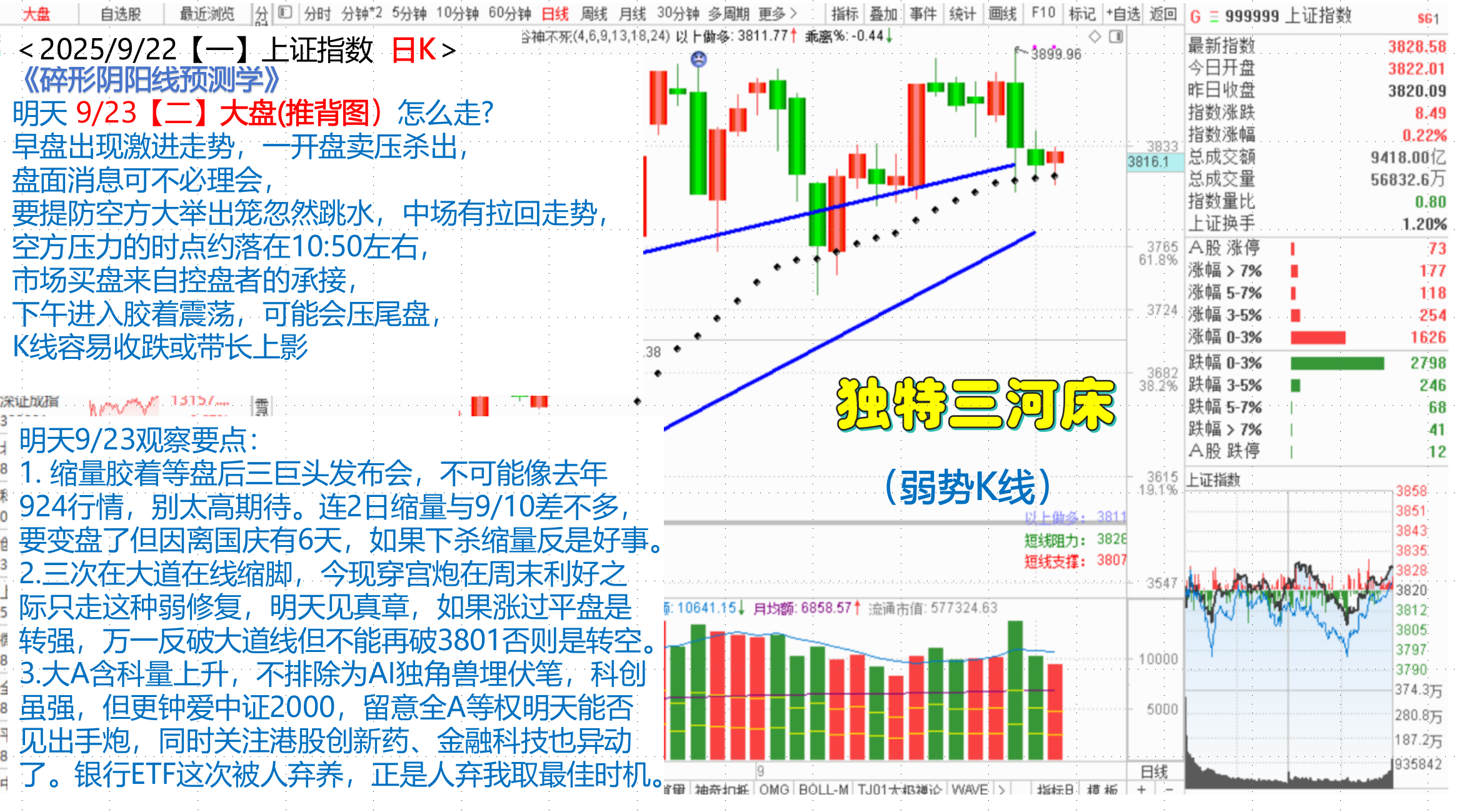 (3) 三次在大道在线缩脚,今现穿宫炮在周末利好之际只走这种弱修复,明天见真章,如果涨过平盘是转强,万一反破大道线但不能再破3801否则是转空。