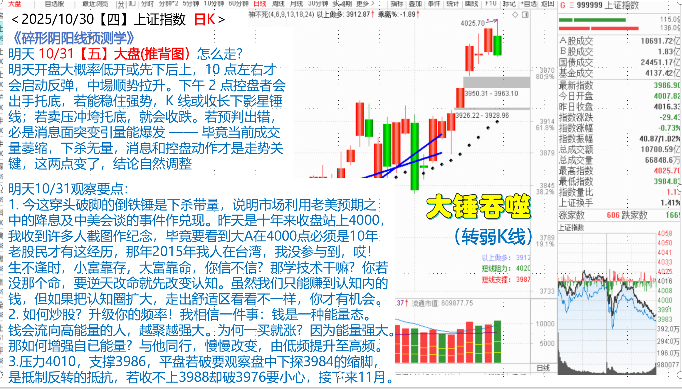 3.压力4010,支撑3986,平盘若破要观察盘中下探3984的缩脚,是抵制反转的抵抗,若收不上3988却破3976要小心,接下来11月。