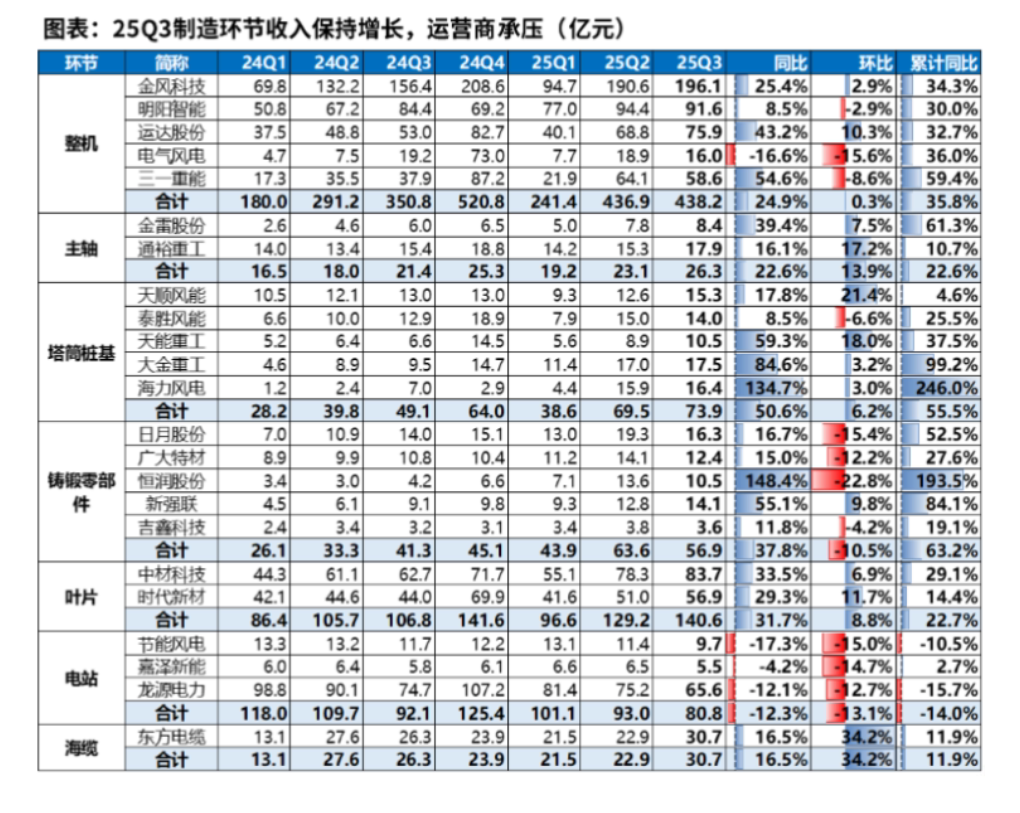 风电 C3 风机量价齐升趋势明确,整机环节高溢价订单从 Q4 开始交付,盈利弹性释放周期延至 2027 年。管桩环节受益于海缆环节逐步明确、海缆环节进入进步确认阶段,盈利能力确认从 Q4 起延续至 2027 年,管桩环节持续高景气。