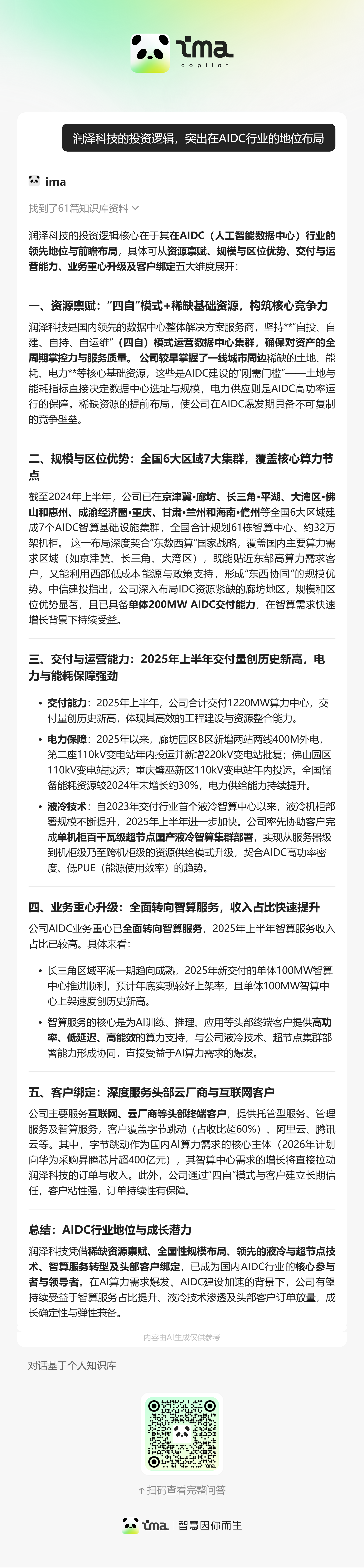 润泽科技 | 字节核心 IDC 合作方,园区级智算中心服务模式,匹配云厂长期需求 | 在运营 750MW,廊坊等关键区位总储备 3.2GW,扩容空间充足 | 中期稳定交付情景下 60%+ |