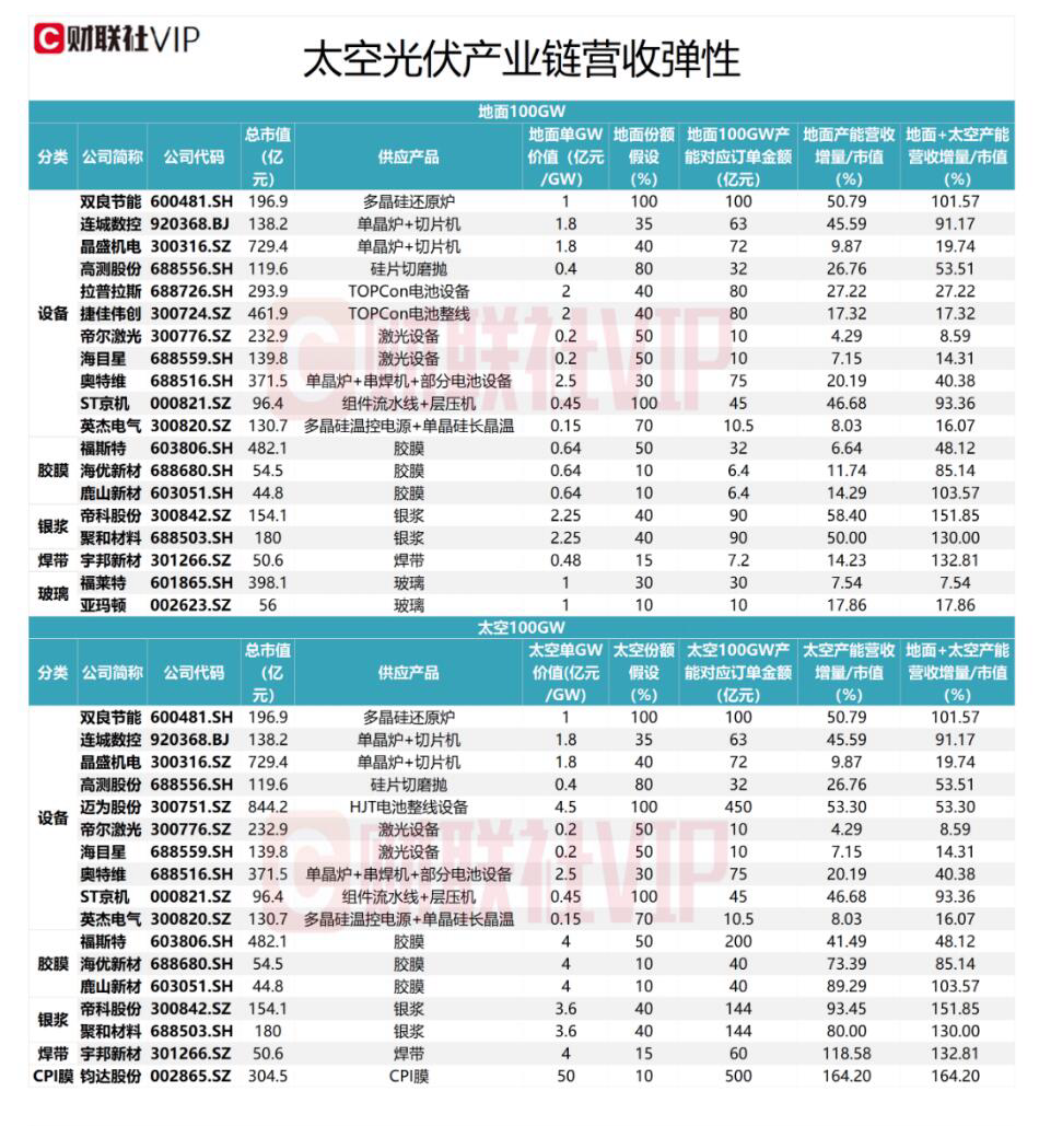 迈为股份供应 HJT 电池整线设备,其地面 + 太空产能营收增量 / 市值为 53.3%;